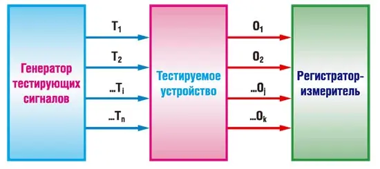 На вход ЧЯ (исследуемого изделия) с выхода соответствующего генератора подается воздействие в виде тестирующего сигнала с необходимыми параметрами (Т1 Т2, ..., Тi). С выхода ЧЯ с помощью соответствующего регистратора (измерителя) снимается результат такого воздействия - отклик (O1 О2, ..., Оk) и анализируются числовые значения выбранного параметра или характеристики.