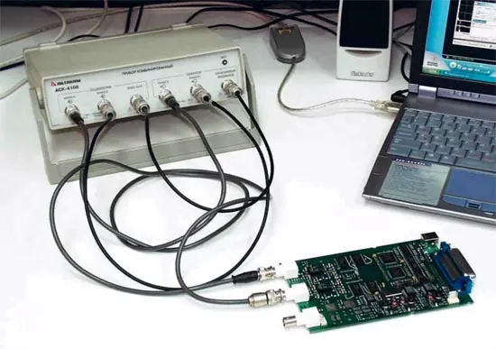 На рис. 3 показан макет измерительной системы на базе комбинированного прибора АСК-4106. Ко входу ЧЯ подключен выход канала А модуля генератора сигналов АСК-4106, а выход ЧЯ - ко входу канала А модуля осциллографа. Таким образом, подавая с помощью генератора различные испытательные сигналы (ИС), можно увидеть реакцию исследуемого устройства. Для того чтобы скомпенсировать собственные искажения прибора (например, неравномерность АЧХ осциллографа), будем также подавать тот же испытательный сигнал с канала В генератора напрямую на канал В осциллографа. Теперь, сравнивая измеренные сигналы по обоим каналам, обнаружим только влияние ЧЯ (пренебрегая тонкими различиями между каналами прибора).