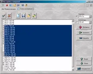В программе АСК-4106 для этой цели вводится понятие траектории измерений, представляющей собой последовательность точек измерений. Каждая точка измерений - это совокупность нескольких величин: частоты повторения испытательного сигнала, размаха напряжения, шаблона формы и флага использования этой точки при измерениях. Шаблон формы задает характер испытательного сигнала: синус, прямоугольник, дельта-импульс или любая произвольная форма. Флаг использования позволяет включать или исключать данную точку из текущей серии измерений, не удаляя ее из траектории.