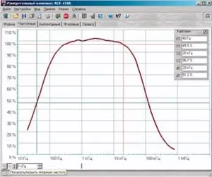 Зависимость среднеквадратичес-кого значения (СКЗ) амплитуды выходного сигнала от частоты входного сигнала (амплитудно-частотная характеристика, АЧХ) изображается на вкладке "Частотные" (рис. 6). Ось значений этого графика может работать в двух режимах. В первом режиме по этой оси откладывается измеренная величина коэффициента усиления (отношение СКЗ выходного сигнала к СКЗ входного сигнала), в линейном или логарифмическом масштабе. Во втором режиме дополнительно включается возможность использования опорного уровня. При этом выводится отношение измеренного в данной точке коэффициента усиления к некоторому фиксированному уровню, либо к уровню, определенному на указанной частоте, либо к уровню, введенному в явном виде.