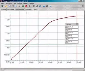 На вкладке "Амплитудные" (рис. 7) отображается зависимость среднеквад-ратического значения амплитуды выходного сигнала от среднеквадратичес-кого значения амплитуды входного сигнала (амплитудная характеристика). Если текущая траектория измерений служит для измерения АЧХ и амплитуда входного сигнала поддерживается постоянной во всех измеряемых точках, этот график будет не слишком наглядным, представляя собой вертикальную линию. В этом случае пользователь может запретить программе строить ненужный график. Это же относится и к графикам АЧХ и ФЧХ при измерении амплитудной характеристики (когда измерения проводятся при фиксированной частоте ИС).