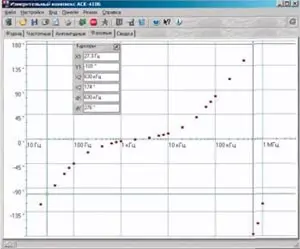Фазо-частотная характеристика (ФЧХ) отображается на графической вкладке "Фазовые" (рис. 8). На этом графике выводится зависимость величины угла сдвига фаз выходного сигнала относительного входного от частоты входного ИС. Величины углов могут по выбору пользователя отображаться в градусах, радианах, градиентах или в долях полного круга.