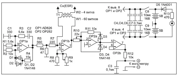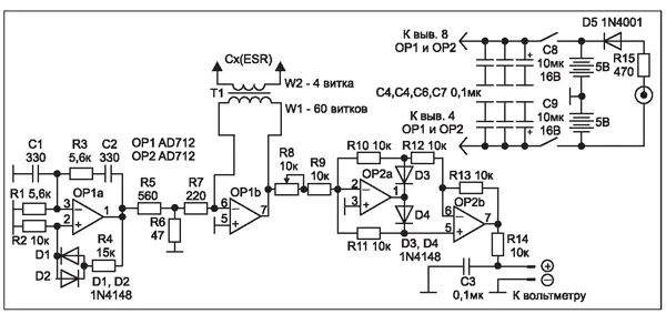 Рис. 4. Принципиальная электрическая схема измерителя ESR на ОУ типа AD712