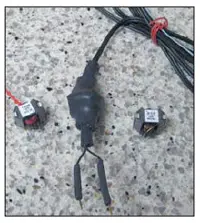В качестве Т1 применен трансформатор, использующийся в цифровой телефонии. Он выполнен на Ш-об-разном ферритовом сердечнике. Размеры трансформатора - 15х15 мм. Он имеет две одинаковые обмотки, которые соединяются последовательно. Общая индуктивность первичной обмотки (60 витков эмалированного провода диаметром 0,1 мм) - 28 мГн. В окно сердечника пропускается 4 витка тонкого многожильного монтажного провода, к концам которого припаиваются щупы. К первичной обмотке подсоединяется обычный 2-проводный кабель длиной 65.70 см. После этого трансформатор помещается в термоусаживаемую изоляционную трубку (рис. 2). Вместо подобного трансформатора можно применить самодельный с аналогичным параметрами, но намотанный, например, на ферритовом кольце.