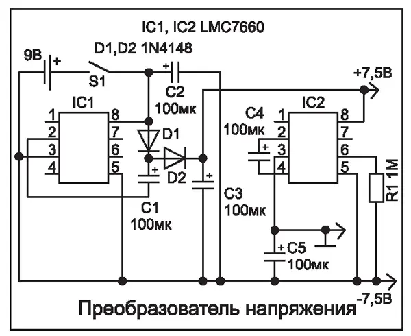 Для питания устройства от одной батареи (9 В) был собран преобразователь на двух микросхемах LMC 7660 (на первой -удвоитель напряжения, на второй