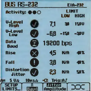 Тестирование состояния шины с помощью ScopeMeter Fluke 125 позволяет найти такие неисправности, как дефектные или отсутствующие оконечные нагрузки, не соответствующие рабочей документации ответвления кабелей, и обрывы линий, а также короткие замыкания и отражения (неоднородности цепи). В режиме тестирования прибор непрерывно получает сигнал от шины и сравнивает его с утвержденными техническими характеристиками. Отображаются битрейт шины и измеренные параметры качества сигнала с индикацией оценки соответствия для таких параметров, как время нарастания и спада, амплитуда, уровень смещения, длительность и искажение формы импульсов.