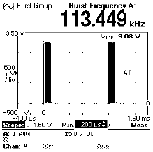 Среди частотных измерений измерения вспышек — наиболее трудная проблема. Можно пытаться измерить частоту несущей во вспышке или, напротив, частоту повторения вспышек. Fluke-164 позволяет полностью автоматически измерить сигналы со вспышками. Измерения частоты вспышки требуют синхронизации измерения с наличием вспышки. Fluke 164 производит такие измерения полностью автоматически. При измерениях частоты вспышек на одну вспышку проводится только один отсчет. Запуск в режиме удержания стопа может предотвратить счетчик от запуска более чем один раз за вспышку. Рис. 7а и 7б показывают, как Fluke 164 автоматически измеряет оба параметра вспышки. Благодаря высокому разрешению показания состоят из 6 значащих цифр, несмотря на то, что сама вспышка длиной 106 мкс содержит всего 12 периодов.