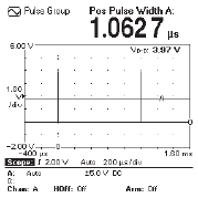В отличие от цифрового запоминающего осциллографа разрешение в технологии Transitional-Sampling™ не зависит от установок временной развертки и захватывает импульсы шириной до 6 нс с разрешением менее 1 нс на всех диапазонах развертки по времени. Это предоставляет уникальную возможность измерения сигналов с малой скважностью. Например, рис. 4а и 4б показывают 1 мкс импульс с радара. Рис. 4а показывает 2 цикла импульса длительностью 1 мс, при этом длительность импульса измеряется с разрешением в 5 разрядов. Рис. 4б показывает форму импульса, при этом частота (или др. параметры) измеряются с очень высокой точностью. Несмотря на малую скважность сигнала 1/1000 Fluke-164 отображает длительность импульса с высокой точностью.