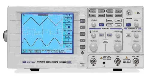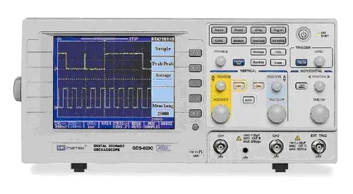 - GDS-820 - полоса пропускания 150 МГц, частота дискретизации 100Мвыбсек, эквивалентная частота дискретизации 25Гвыбсек, длина памяти 125К, дисплей черно-белый, без возможности подключения к ПК.