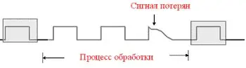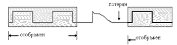 Цифровой осциллограф использует абсолютно другой принцип работы. Входной сигнал, в размере выбранного кадра, пройдя все входные усилители и аттенюаторы поступает на АЦП, где преобразуется в цифровую форму и поступает во внутреннюю память для дальнейшей обработки (привязки к развертке, выводу на экран, измерение параметров и т.д.), время этой обработки достаточно велико по сравнению с временем кадра, задержка при выводе на экран получается достаточно большая, часть информации об изменении сигнала между кадрами теряется бесследно (см.рис.4). Это и есть отображение входного сигнала в нереальном масштабе времени - главный недостаток всех цифровых осциллографов. Его можно попытаться сгладить, но избежать нельзя!