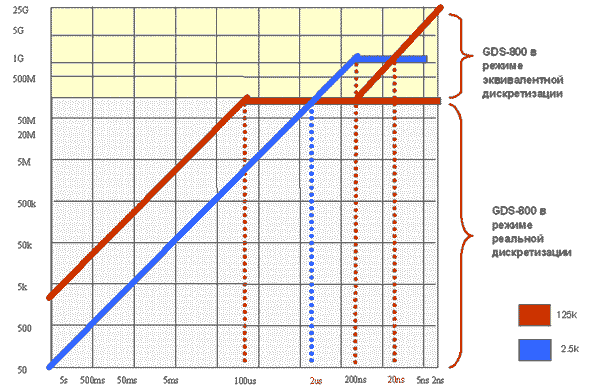 , (4)Возвращаясь к предыдущему примеру не трудно определить частот дискретизации для отображения сигнала во весь экран, это 250 Мегавыборок в секунду! А при времени развертки 10 мксеке/дел частота дискретизации станет 25 Мегавыборок в секунду. Она не 1 ГГц а меньше! Это и логично - зачем на достаточно низких частотах применять высокую частоту дискретизации? Это избыточно, тем более что и память, то короткая… Так что вывод - высокая максимальная частота дискретизации - это хорошо, но реально она не всегда уж высокая! Но если все, таки хочется при этих условиях увеличить частоту дискретизации? Из приведенной выше формулы этот выход очевиден - увеличение объема внутренней памяти! Для осциллографов GOOD WILL Instek серии GDS-800 с объемом памяти 125К при аналогичных условиях частота дискретизации в обоих случаях составит 100 Мегавыборок в секунду. А возможность изменения объема памяти от 0,5К до 125К дает самые широкие возможности для манипуляции как частотой дискретизации, так и максимальной растяжкой сигнала! График соотношения частоты дискретизации для осциллографов с объемом памяти 2,5К и дискретизацией 1Гвыборок в сек и 125К и 100 Мегавыборок в секунду приведен ниже.