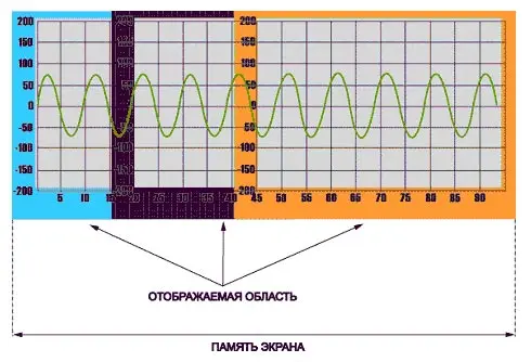 У осциллографов GOOD WILL Instek 800-серии, объем экранной памяти в два раза превышает объем информации способной выводиться на ЖКИ. То есть сигнал записан в память экрана как 20 делений на экран, но на ЖК-экран размером 10 делений выводится информация только о 10 клетках, причем перемещением луча по-горизонтали возможно просматривать и другие области экранной памяти. У Tektronix этого нет. Схематичное изображение этого процесса приведено на рис.19.Синим, красным и желтым цветом показаны перемещения физического экрана, сама же экранная область лежит в пределах от левого края синей границы, до правого края желтой границы.