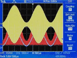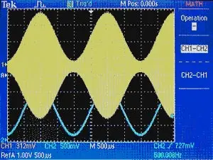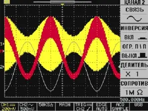 Следующий недостаток осциллографов Tektronix обнаруживается в двухканальном режиме и в режиме математической обработки сигнала - сложение или вычитание. Канал 1 (желтого цвета) имеет преимущество перед каналом 2 (синего цвета), это означает, что часть полезного сигнала канала 2 в двухканальном режиме будет "похоронена" по желтым слоем канала 1. Его не видно!!! А если добавить режим математической обработки - то суммарный сигнал, то ради чего это режим существует, будет "похоронен" под сигналом канала 2, и они оба (канал 2 и суммарный) будут задавлены сигналом канала 1! Это наглядно представлено на рис. 20 и 21.