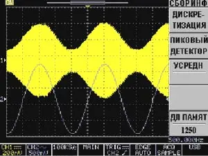 Математические функции с входными сигналом. Помимо стандартных для двухканального осциллографа режимов сложении и вычитания сигналов, осциллографы серии GDS-800 имеют возможность производить усреднение входного сигнала за количество периодов 2,4,8…256, это в том числе позволяет исследовать сигналы искаженные шумом. А наличие пикового детектора дает возможность фиксировать короткие случайные выбросы.