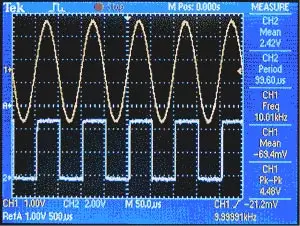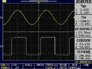 Как уже было указанно выше основным недостатком цифровых осциллографов является потеря части полезного сигнала во время его обработки. Рис. 13 еще раз демонстрирует этот недостаток, часть сигнал отображаемого на экране выделена окном, отчетливо виден кусок сигнала который никогда не будет виден пользователю.