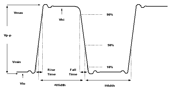 Временные параметры -частоту (F), период (Т), время нарастания, время спада, скважность импульсов, длительность импульса (положительную и отрицательную).