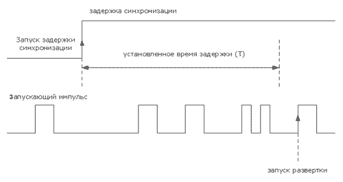 Задержка запуска развертки по времени. Пользователь может задать время задержки от момента появления импульса синхронизации до момента запуска линии развертки. Эту задержку возможно регулировать в пределах 100 нсек…1,3 мсек. На рис.27 приведены пояснения к этому режиму. В момент появления первого импульса запускается схема задержки схемы синхронизации, время задержки определяется пользователем и равно Т, после окончания этого времени лини развертки будет запущена первым импульсом, следующим после окончания времени задержки.