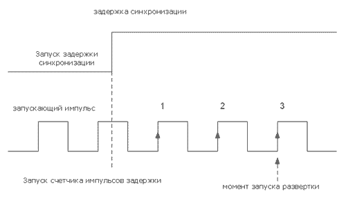 Задержка запуска развертки по событию. Пользователь может задать количество событий (импульсов) от момента появления импульса синхронизации до момента запуска линии развертки. Пользователь может регулировать количество событий в пределах 2…65000. На рис.28 приведены пояснения к этому режиму. В момент появления первого импульса запускается схема задержки схемы синхронизации, количество импульсов задержки (на рис.28 их два) определяется пользователем, после окончания последнего события лини развертки будет запущена первым импульсом, следующим после окончания времени задержки (третий импульс).