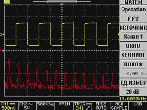 Быстрое преобразование Фурье (БПФ). Применение встроенного микропроцессора с высоким быстродействием позволила дополнить возможности осциллографов 800-серии такой функцией как БПФ. Это по сути цифровой программный анализатор спектра с неплохим динамическим диапазоном, он позволяет оперативно отобразить спектр сигнала присутствующего в настоящий момент на экране осциллографа и измерить параметры всех его гармоник! Пример на рис.29 демонстрирует сигнал прямоугольной формы и его спектр.