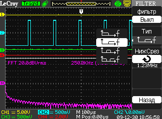 Кроме четырёх основных математических функций в осциллографах WaveAce можно выполнить частотный анализ с помощью быстрого преобразования Фурье (БПФ), как приведено на рисунке 7. Функция БПФ может применяться, например, для подстройки усилителей, поиска гармонических искажений и спектральных отклонений в их работе. Для этого на усилитель подаётся синусоидальный сигнал и исследуется выходной сигнал с усилителя с включённой в осциллографе функцией БПФ.