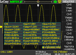 При исследовании сигнала с помощью осциллографа обычно возникает необходимость произвести измерения параметров захваченного сигнала (например: среднее значение уровня сигнала, частота, выброс на вершине, фазовый сдвиг, задержка и др.). С этой задачей осциллографы серии WaveAce успешно справятся и позволят произвести 32 вида автоматических, в том числе специфических временных измерений (в сопоставимых моделях ~11…20 параметров), а также курсорных вычислений. Результаты автоматических измерений можно выводить на экран в одну из 3-х таблиц с группировкой по параметрам: "Время", "Напряжение", "Задержка". Или одновременно вывести их на экран в виде единой таблицы, как показано на рисунке 4.