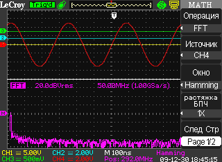 Рисунок 7. Результат БПФ синусоидального сигнала канала 4 (внизу), входной сигнал (сверху)