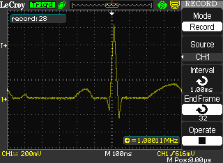 Режим "Пикового детектора" используется для обнаружения всплесков длительностью от 10 нс и снижения вероятности возникновения искажений при отображении сигнала. Данный режим может эффективно использоваться при положении переключателя Вр./Дел. 5 мкс/дел и более. В этом режиме запоминаются минимальные и максимальные значения за всё время накопления отсчётов. Этот режим удобен, например, при исследовании сигнала содержащего регулярные, но короткие по времени выбросы.