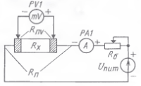 Суть метода можно выразить следующей фразой: "если избавиться от паразитного сопротивления невозможно, то следует исключить его влияние". Изложенное поясняется рисунком. Через измеряемое сопротивление Rx пропускают ток, регулируемый балластным резистором R6 и контролируемый амперметром РА1 Падение напряжения на Rx измеряют милливольтметром PV1. Обратите внимание - вольтметр подключен непосредственно к Rx, поэтому влияние Rn полностью исключается. При этом, правда, появляется паразитное сопротивление Rnv в цепи вольтметра, образуемое контактным сопротивлением в точках подключения вольтметра (на рисунке показаны стрелками) и сопротивлением соединительных проводов вольтметра. Однако влияние Rnv пренебрежимо мало и его можно не учитывать, поскольку условие Rv > Rnv (где Rv - входное сопротивление вольтметра) выполняется практически всегда Действительно, минимальное значение входного сопротивления мультимет-ра у самых простых моделей составляет 1 МОм, а значение Rnv заведомо меньше 1 кОм. Значение Rx измеряемого сопротивления вычисляют по известной простейшей формуле Rx= U/I.