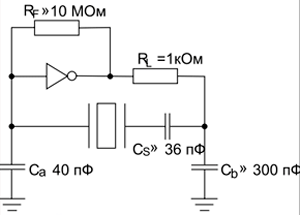 Схема строится на основе кварцевого резонатора и КМОП инвертора по принципу генератора Пирса.