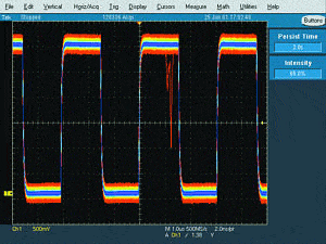 Рис. 2. Неуловимый сбой. Быстрая скорость сбора осциллограм, допускаемая технологией DPX, дает вероятность фиксации неуловимых сбоев и других нечастых событий.