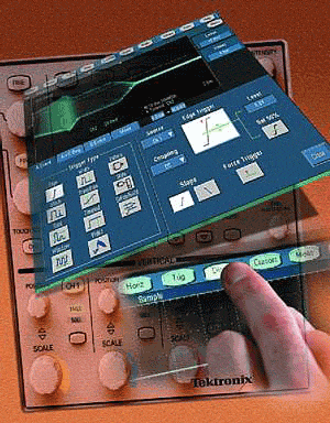 Рис. 4. Интуитивный интерфейс пользователя. Серия TDS5000 предлагает множественные способы использования прибора: кнопки аналогового стиля, опускающиеся меню, мышь, и дополнительный сенсорный экран.