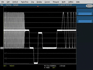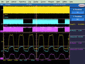 Это проявляется в интерфейсе пользователя, в котором предоставляется выбор между поворотными ручками, как на аналоговых приборах, и работой с мышью, клавиатурой, Touchscreen (вариантно), управлением через Pulldown-меню, а также включение осциллографа с помощью Windows- и Unix-API и стандарты связи с другими приложениями измерительной техники или программами документации. "Приманкой" является наверняка и функция сдвоенного монитора. Встроенный 10,4-дюймовый цветной дисплей индицирует текущее состояние сигналов, в то время как дополнительный монитор компьютера представляет, например результат анализа сигналов -- или наоборот, когда процесс измерений перебрасывается через специальный Scope-Display-разъем на внешний монитор. Далее в распоряжении имеются все стандартные интерфейсы компьютера: USB, LAN, периферия PS-2, а также последовательные и параллельные порты и не в последнюю очередь Soundcard с соответствующими I/O. Как вариант, ничто не мешает реализовать обмен данных с помощью логических анализаторов Tektronix серии TLA, при условии, что имеется опция с iView. В этом случае на дисплее логического анализатора можно представить Digital-Traces, коррелированными по времени с аналоговыми сигналами, измеренными с TDS5000.