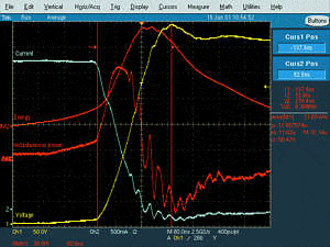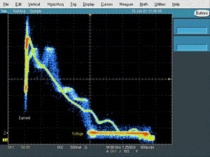 Внедренное проектирование (см. рис. 6). Источник синхронная, двойное-накачанная шина. Канал 1 (желтый) - сигнал времени, канал 2 (синий) - сигнал строба, и канал 3 (розовый) - строка данных. Верхняя половина показывает цикл записи, давая возможность проектировщикам измерить эффективность производительности их систем, сравнивая оперативное время записи с мертвым временем. Основная половина показывает раскрытый вид маленького интервала времени, показанный на верхнем участке, давая возможность проектировщикам делать критические измерения синхронизации. Измерение мощности Гибкий и мощный набор автоматических измерений и математики у осциллографов серии TDS5000 делает его идеальным решением для измерений мощности, напряжения, тока и мгновенной мощности и энергии.На рис. 7 показан пример измерения мощности. Канал 1 (желтое, помеченное напряжение) показывает выключающееся напряжение на полевом транзисторе переключения электропитания, с потоком на канале 2 (помеченный поток, синий). 1 форма волны, M1 (красная, помеченная мощность), является мгновенной мощностью, следующей из умножения напряжения и текущих форм волны (Ch. 1 * Ch. 2). | ![]() |
