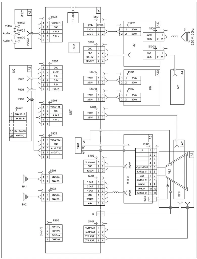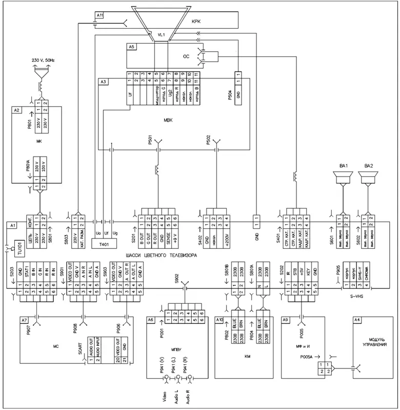 Рис. 3. Схема соединений узлов в телевизорах Horizont 25E06, Horizont 29EF06, Schneider 25E06, Schneider 29EF06
