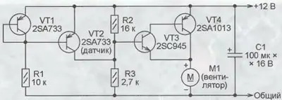Это напряжение через усилитель тока на транзисторах VT3 и VT4 поступает на М1 - электродвигатель вентилятора. Поэтому частота вращения крыльчатки вентилятора и интенсивность создаваемого им потока воздуха растут с повышением температуры датчика - транзистора VT2, закрепленного на обдуваемом вентилятором теплоотво-де мощных элементов блока питания.