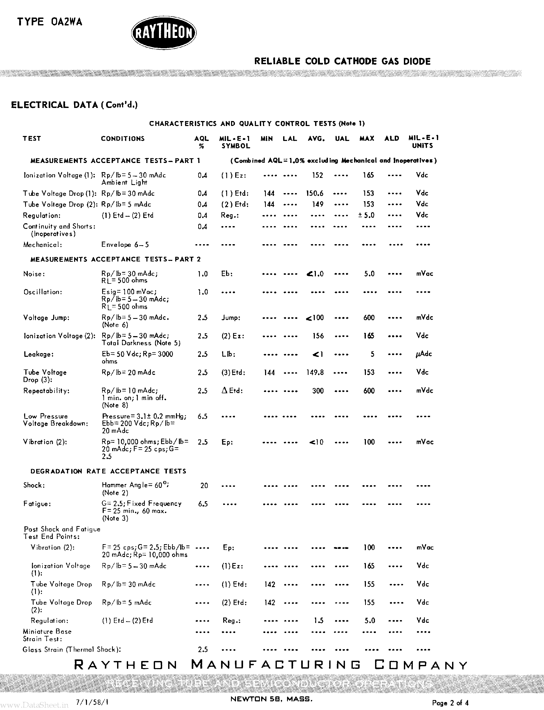 The 0A2WA is a cold cathode, gas-filled diode of miniature construction designed for reliable service as a voltage regulator. It has an operating current range of 5 to 30 milliamperes over which it maintains a substantially constant operating voltage of 150 volts. Three cathode pins are provided which may be used to disconnect the load when the tube is removed from the socket. This type is characterized by long life and it is designed for service where severe conditions of high temperature and mechanical shock or vibration are encountered.