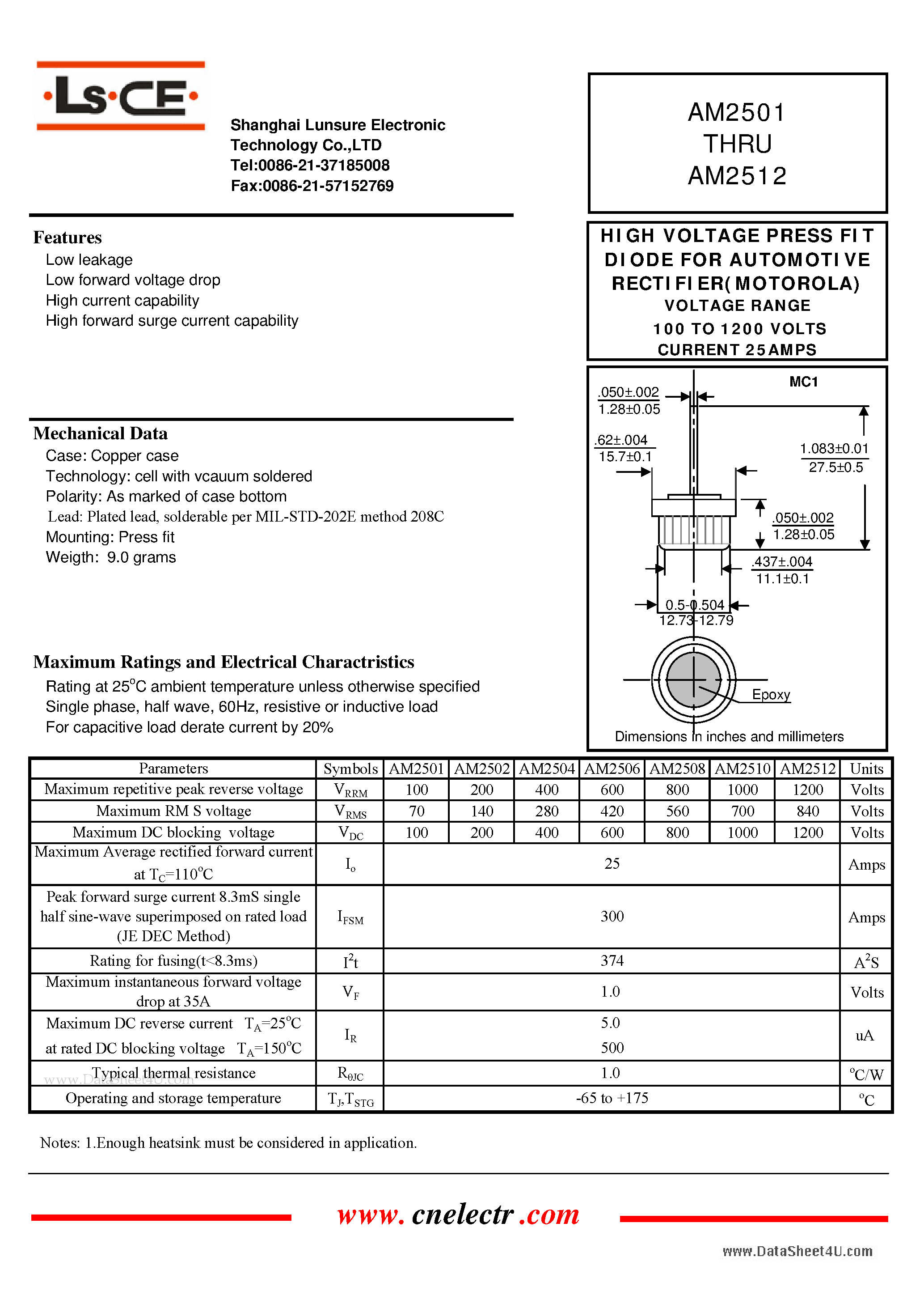 AM2501-(AM2501 - AM2512) HIGH VOLTAGE PRESS FIT DIODE FOR AUTOMOTIVE RECTIFIER