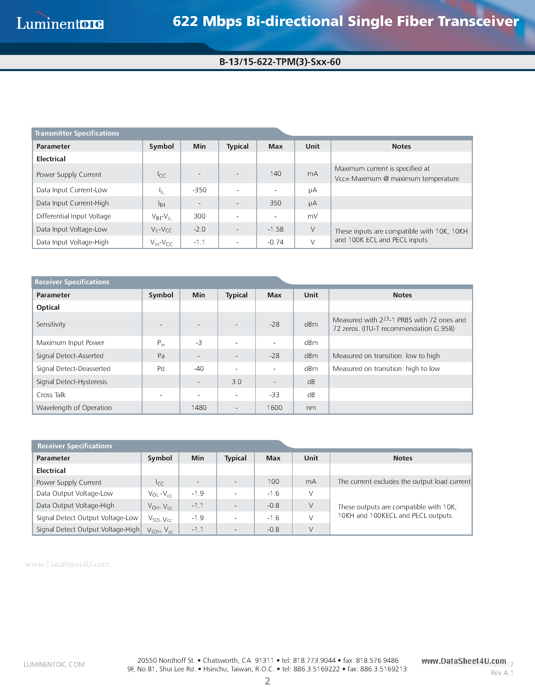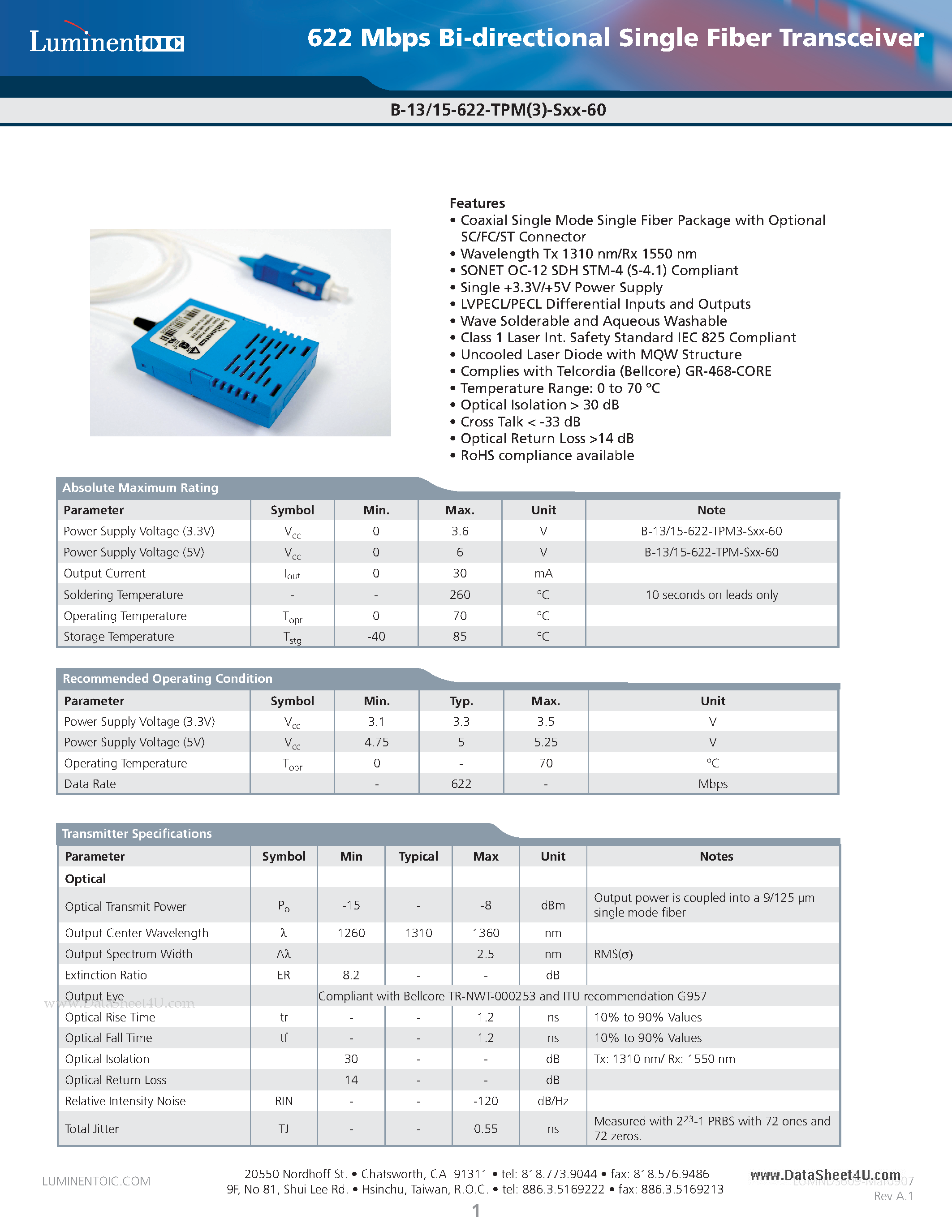 B-13-15-622-TPM-SXX-60-622 Mbps Bi-directional Single Fiber Transceiver