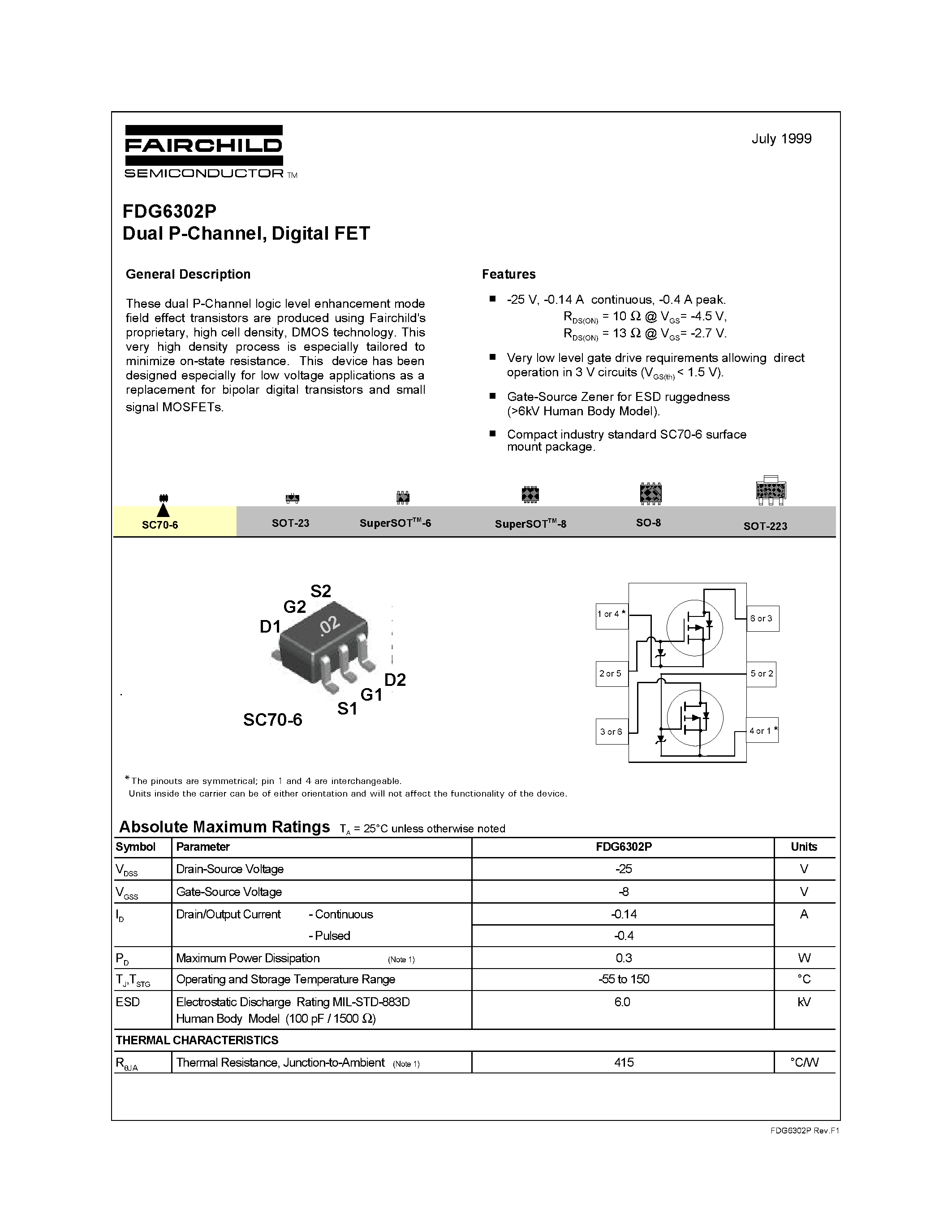 Даташиты (Datasheets FDG6302P) электронных компонентов