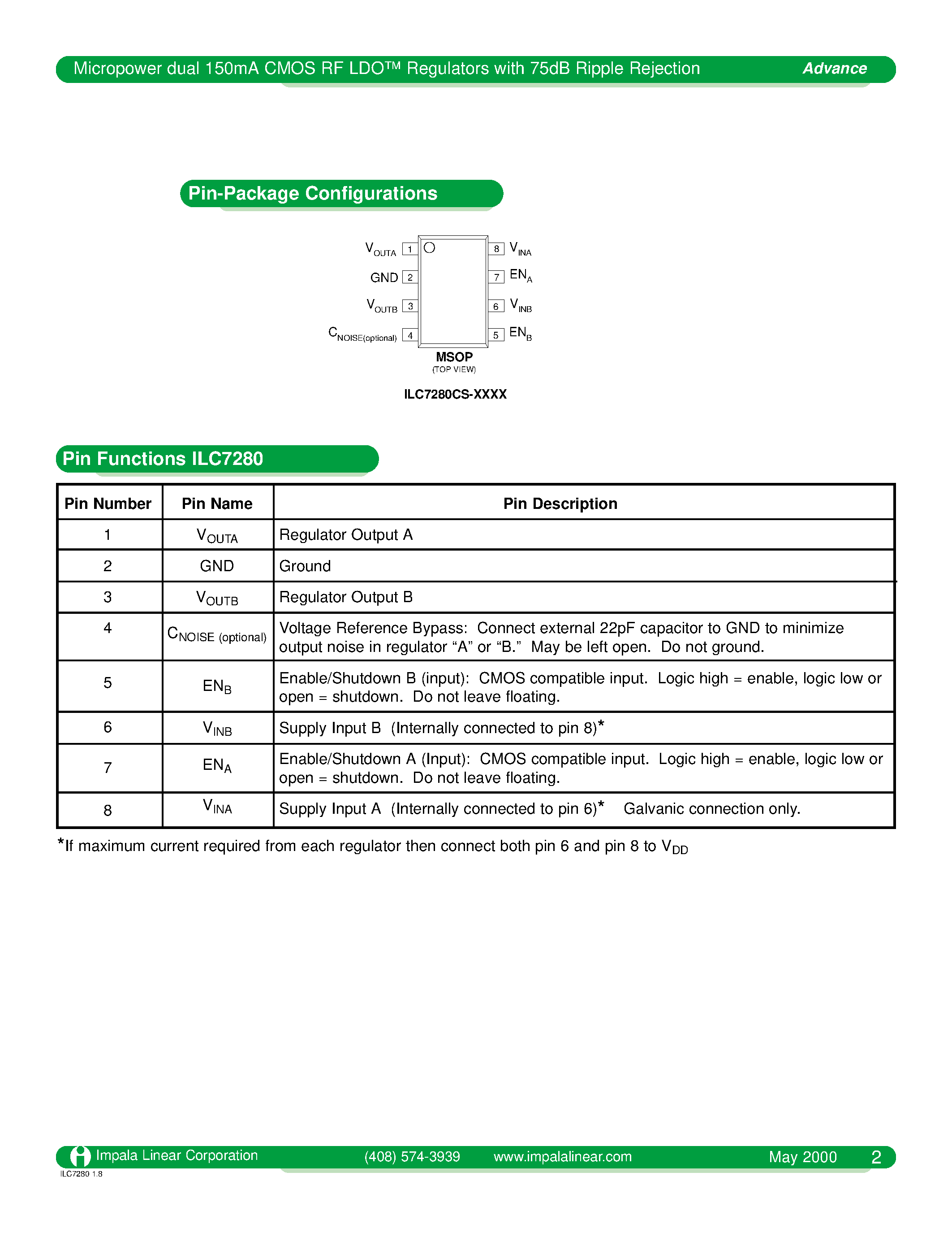 ILC7280CS-2828-MICROPOWER DUAL 150MA CMOS RF LDO REGULATORS WITH 75DB RIPPLE REJECTION