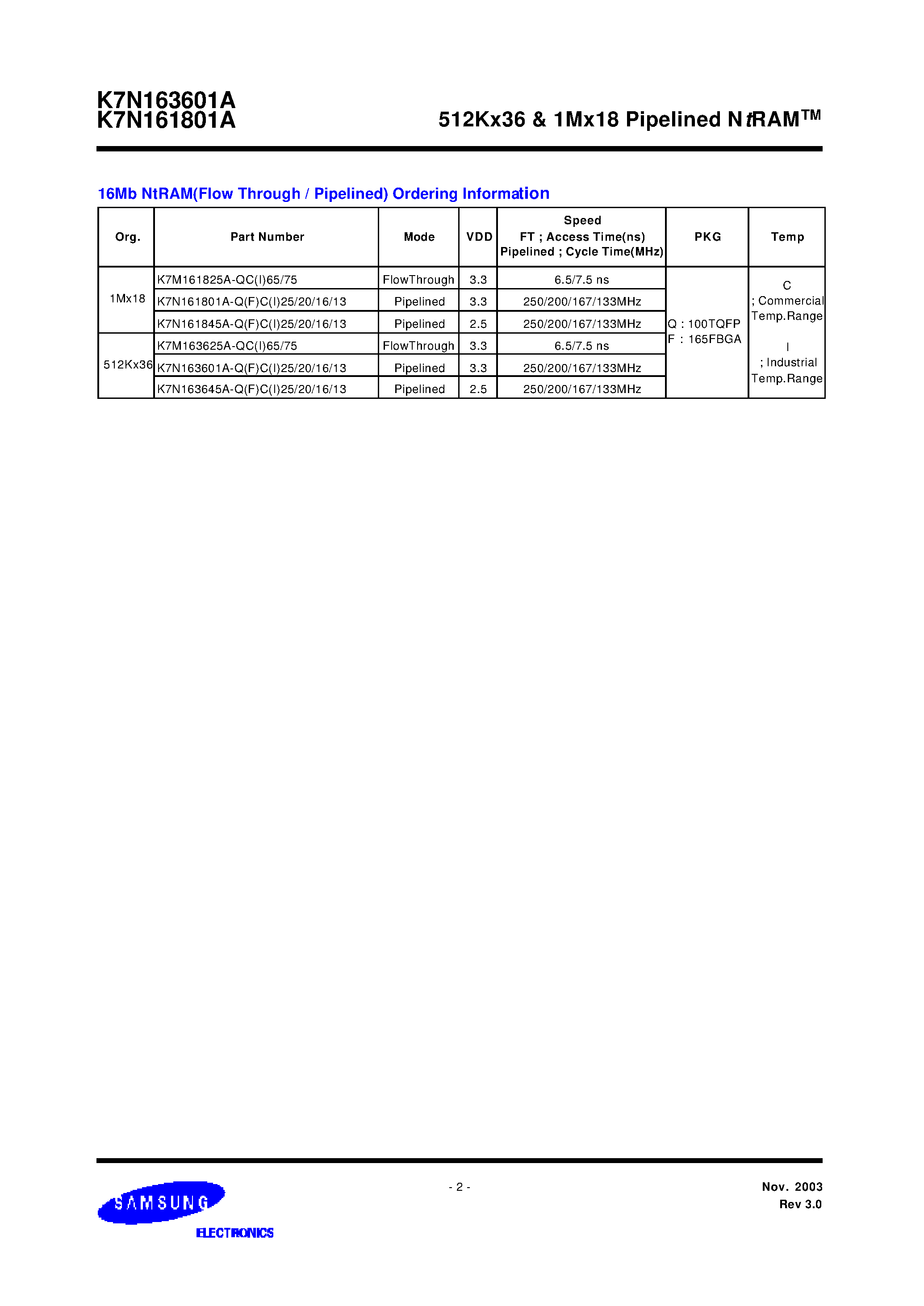 K7N161801A-Q(F)C(I)20-512Kx36 & 1Mx18 Pipelined NtRAM