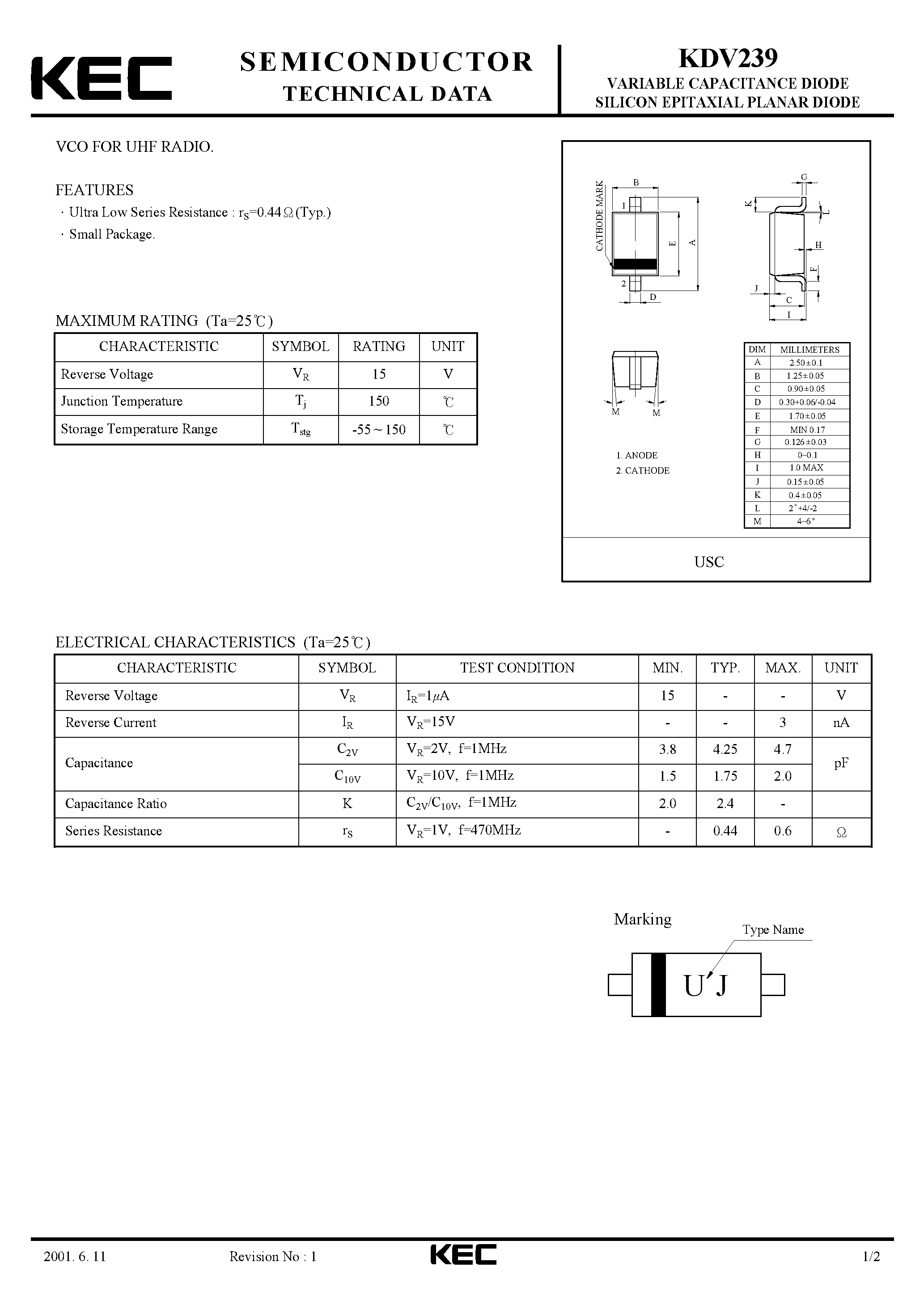KDV239-VARIABLE CAPACITANCE DIODE SILICON EPITAXIAL PLANAR DIODE(VCO FOR UHF RADIO)