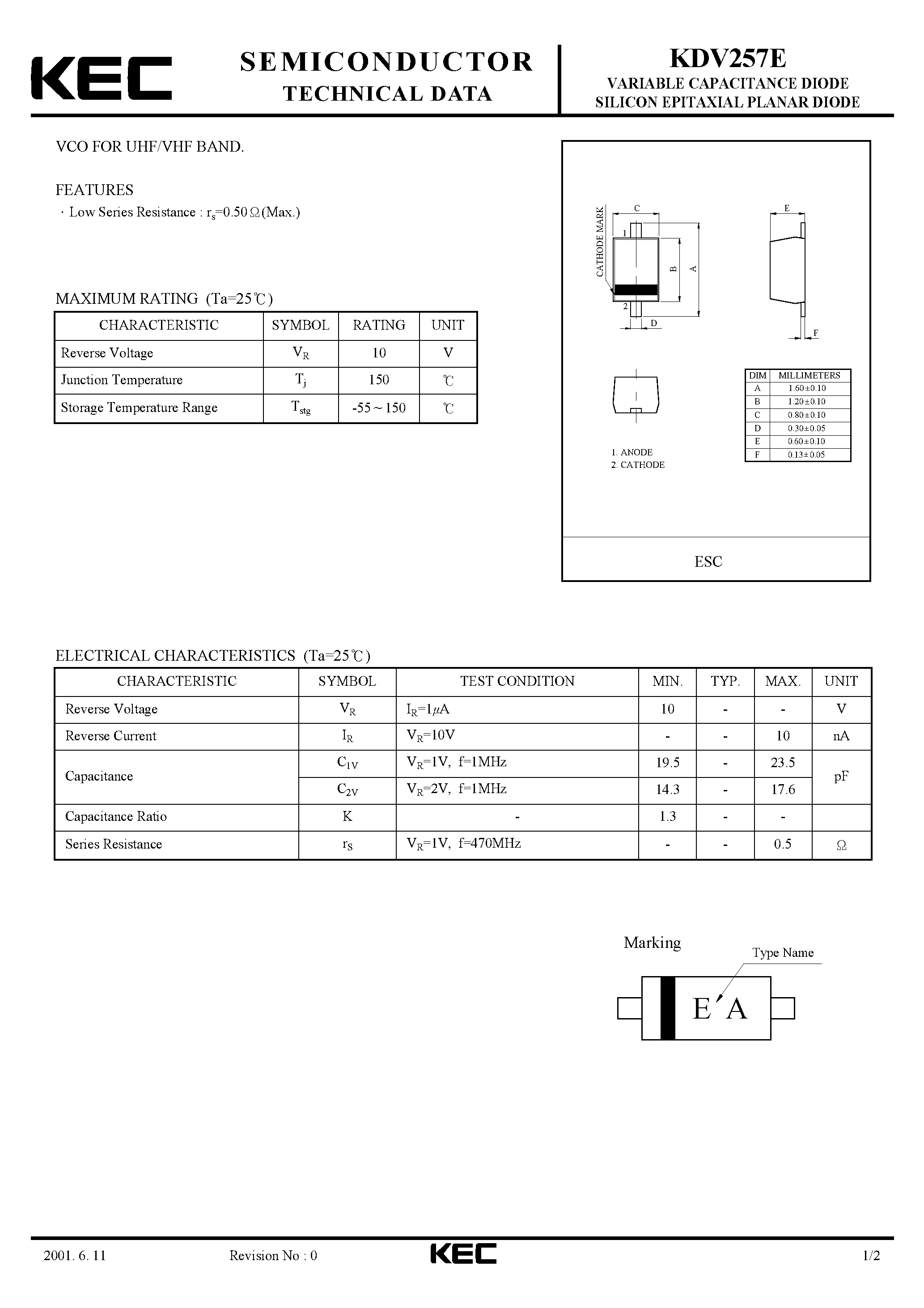 KDV257E-VARIABLE CAPACITANCE DIODE SILICON EPITAXIAL PLANAR DIODE(VCO FOR UHF/VHF BAND)