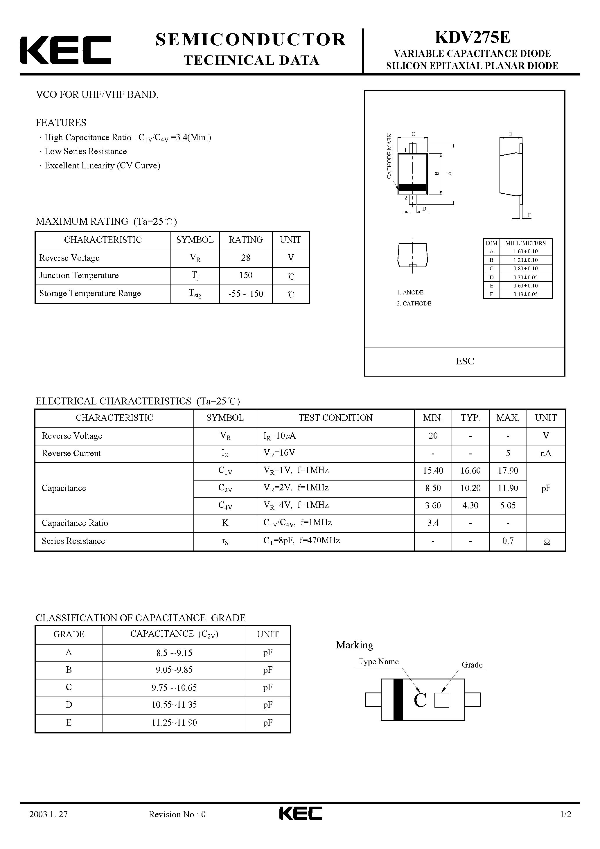 KDV275E-VARIABLE CAPACITANCE DIODE SILICON EPITAXIAL PLANAR DIODE(VCO FOR UHF/VHF BAND)