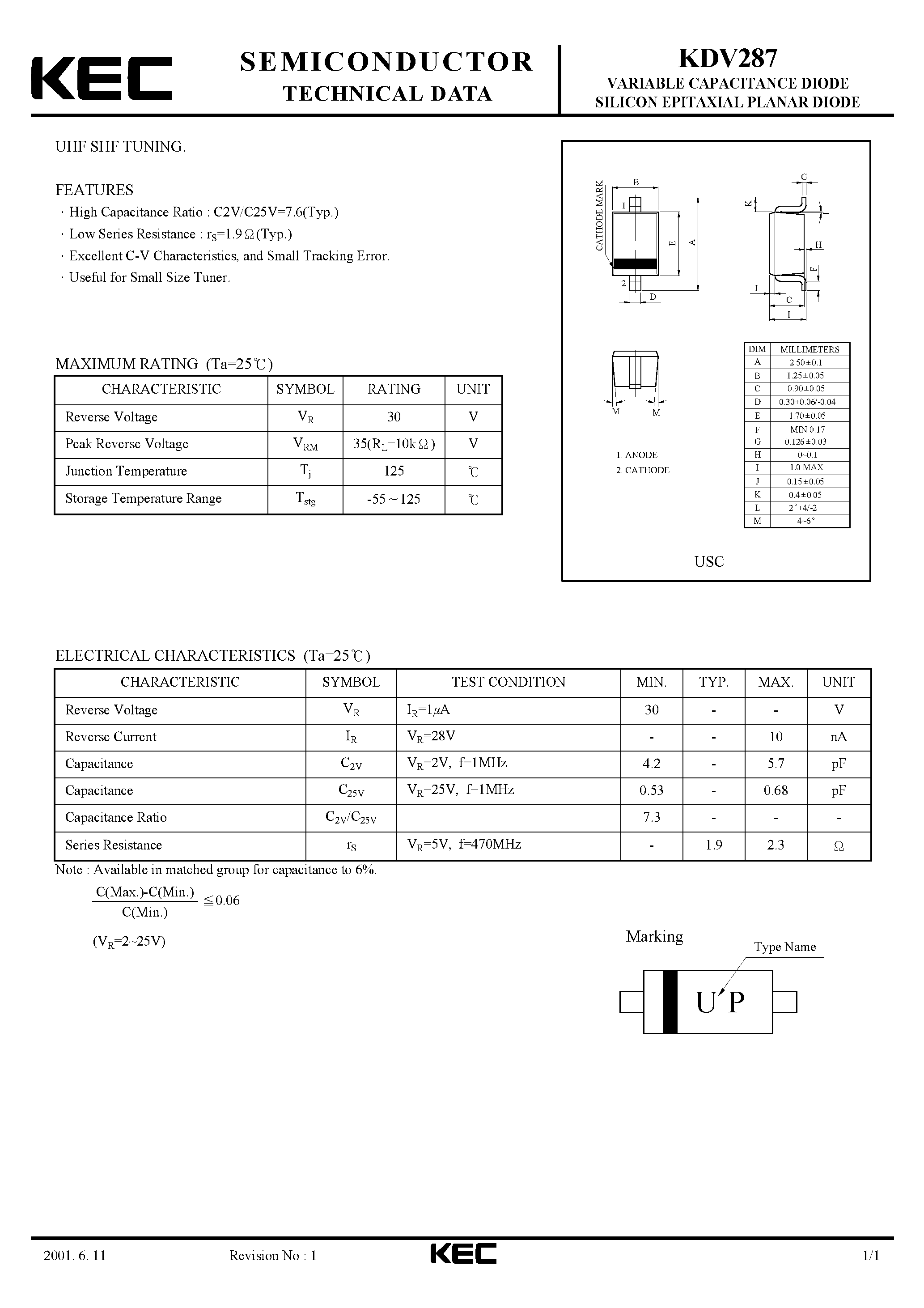 KDV287-VARIABLE CAPACITANCE DIODE SILICON EPITAXIAL PLANAR DIODE(UHF SHF TUNING)