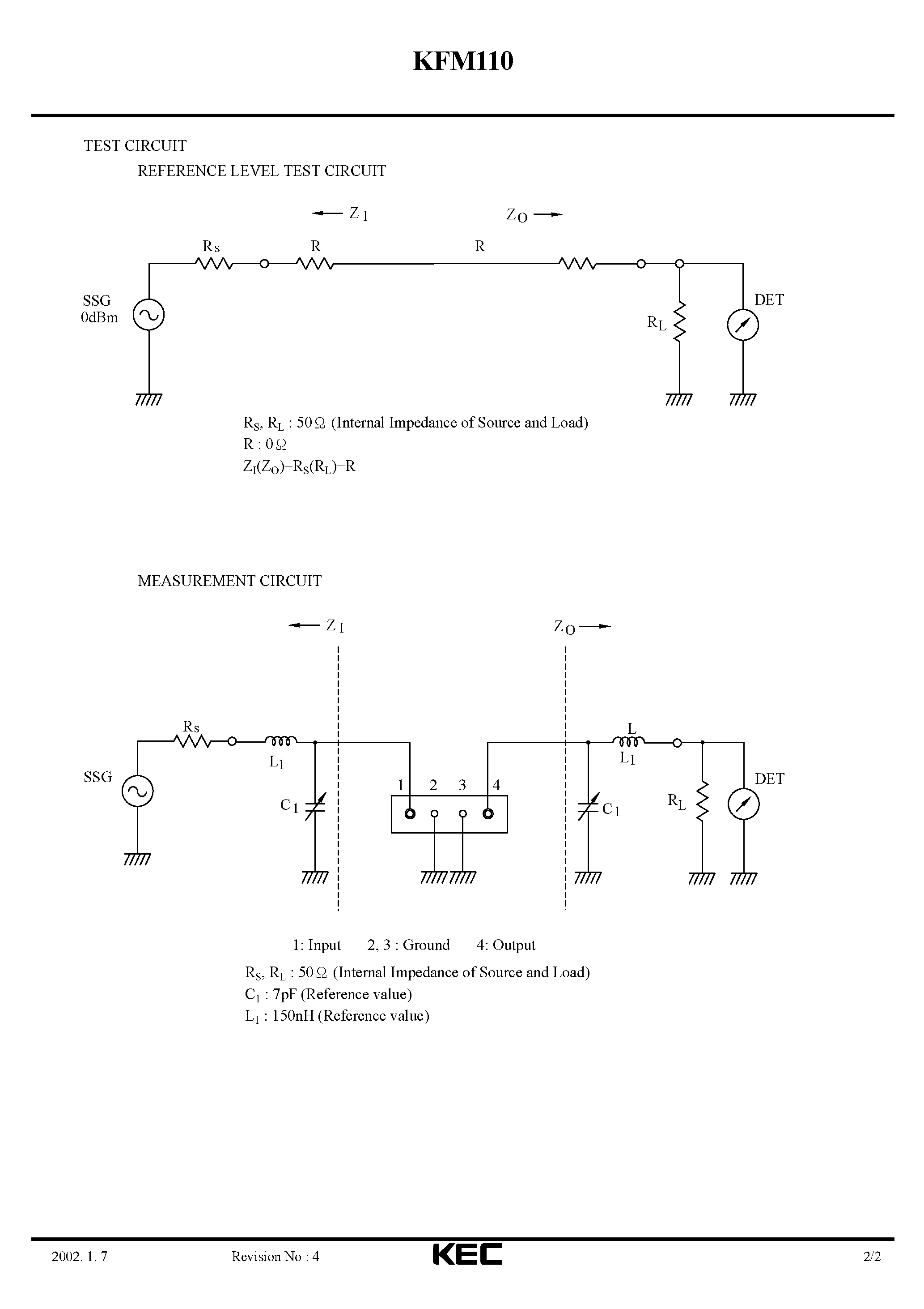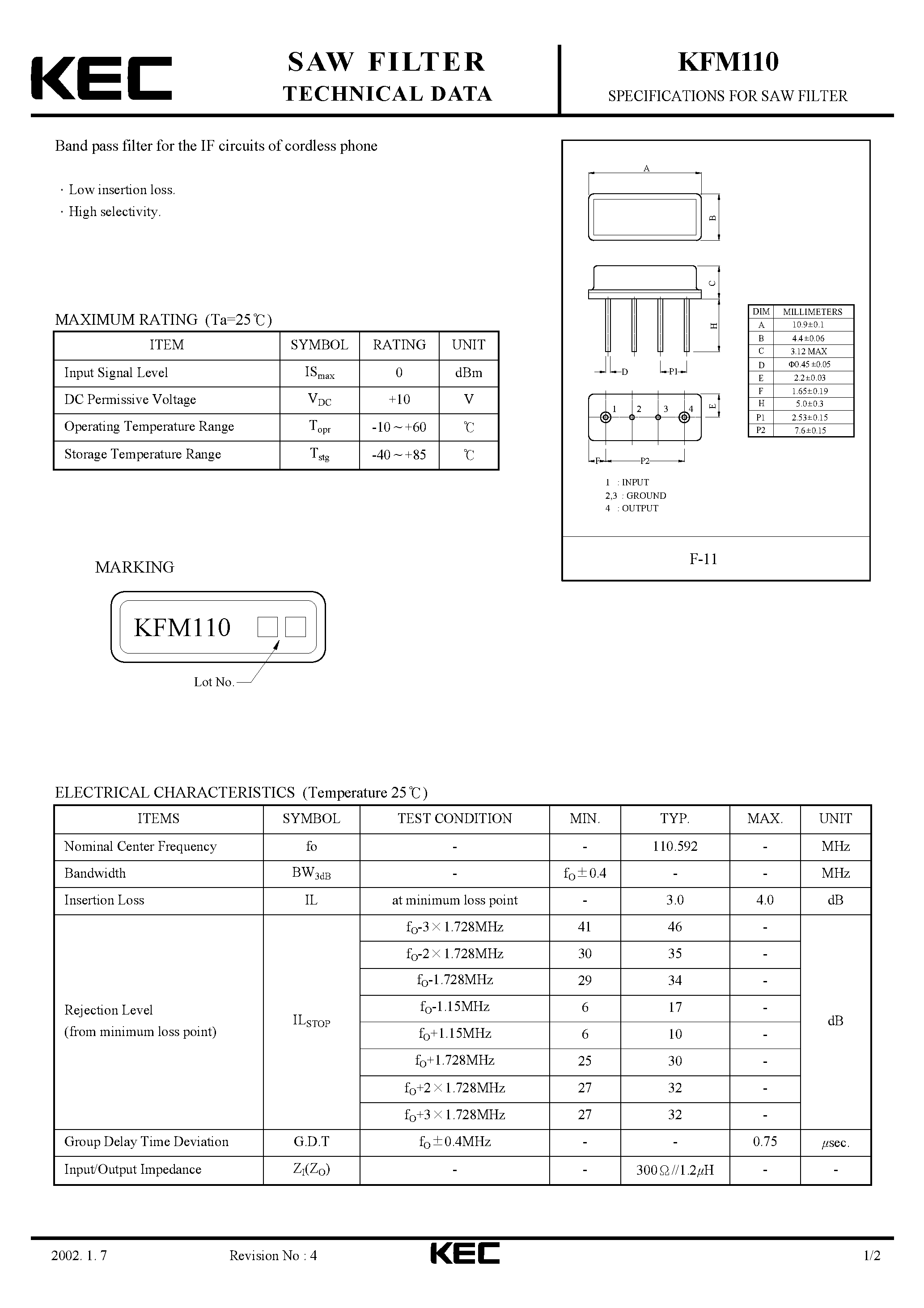 KFM110-SPECIFICATIONS FOR SAW FILTER(BAND PASS FILTERS FOR THR IF CIRCUITS OF CORDLESS PHONE)