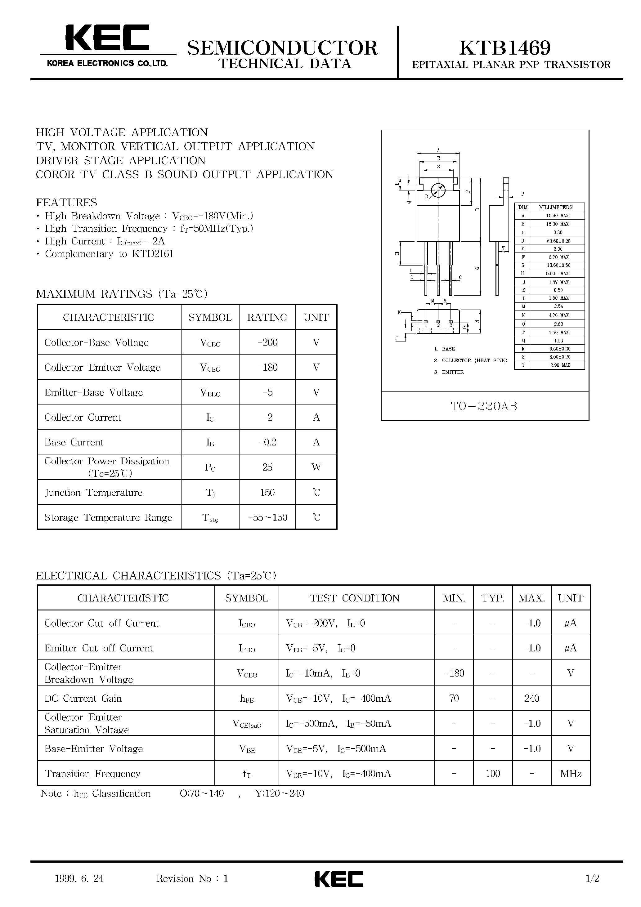 KTB1469-EPITAXIAL PLANAR PNP TRANSISTOR (HIGH VOLTAGE TV/ MONITOR VERTICAL OUTPUT/ DRIVER STAGE/ COLOR TV CLASS B SOUND OUTPUT)