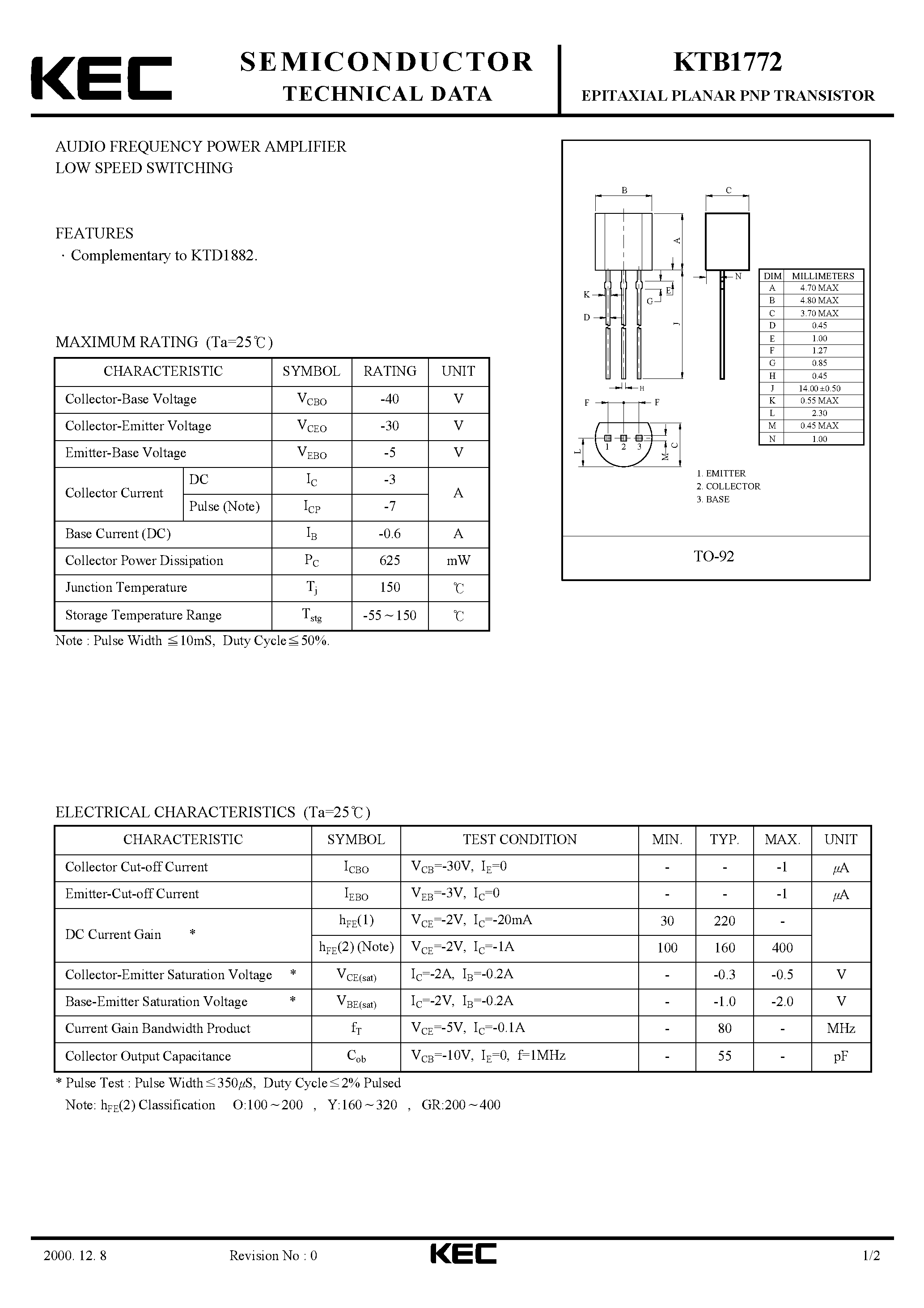 KTB1772-EPITAXIAL PLANAR PNP TRANSISTOR (AUDIO FREQUENCY POWER AMPLIFIER LOW SPEED SWITCHING)