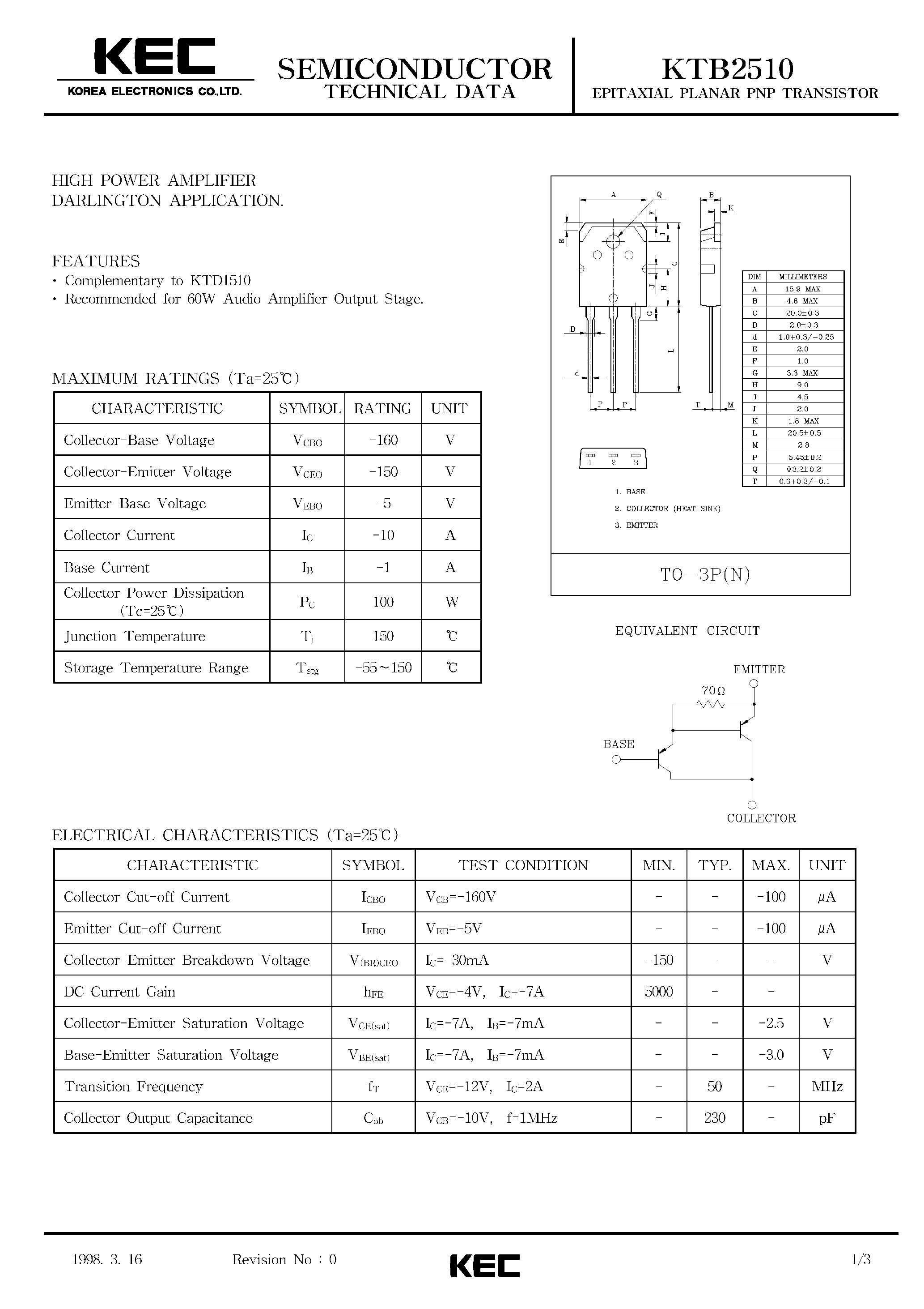 KTB2510-EPITAXIAL PLANAR PNP TRANSISTOR (HIGH POWER AMPLIFIER DARLINGTON)