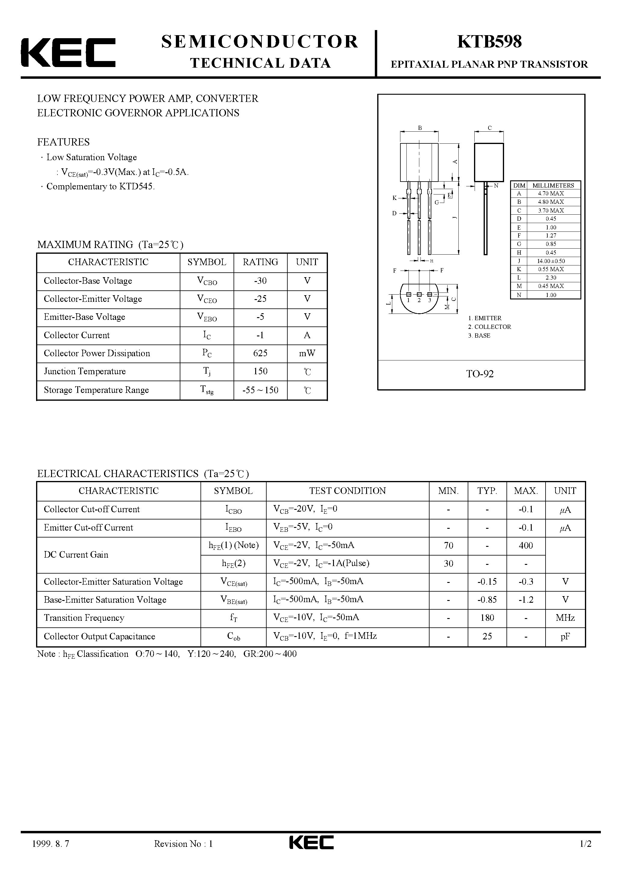 KTB598-EPITAXIAL PLANAR PNP TRANSISTOR (LOW FREQUENCY POWER AMP/ CONVERTER ELECTRONIC GOVERNOR)